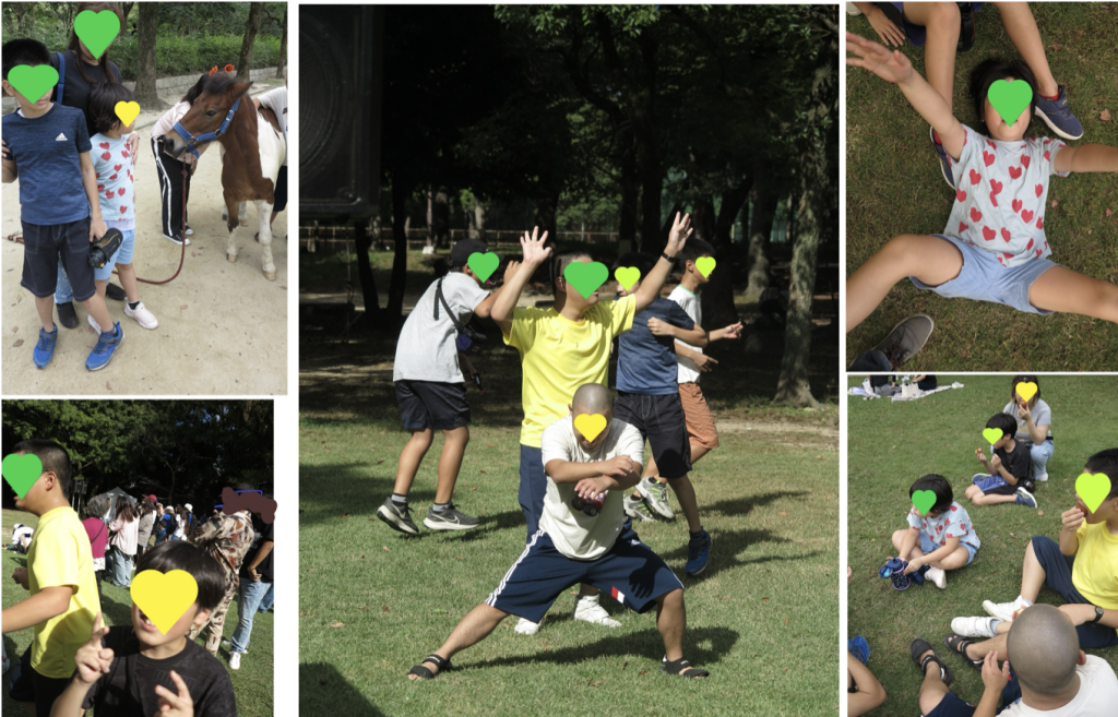 自然いっぱいの園田地区。今年の秋は自然林での食の祭典がありました。当日は、体調不良などで8名の利用。しかもお祭り大好き少年ばかり。じゃあ。というわけで早速お出かけです。芝生広場では、ダンスで大盛り上がり。案の定、子供たちもすぐに参加。あっという間に汗まみれ。ポニーへの餌付け体験をしたところで、みんなもステージを見ながら腹ごしらえ。